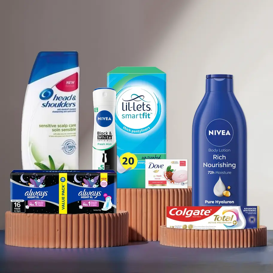The Dove Go Fresh Revive Beauty Cream Soap Bar 4 Pack will leave your skin feeling soft and moisturized, while the Colgate Total Advanced Whitening Toothpaste will keep your smile looking its best. For hair care, the Head & Shoulders Shampoo SENSITIVE 400ML will gently cleanse and soothe your scalp. NIVEA Rich Nourishing Body Lotion and NIVEA Black & White Invisible Fresh Mist Anti-perspirant Deo Spray will keep your skin hydrated and odor-free all day long. And with Always Maxi Thick Sanitary Pads and Lil-Lets Smartfit Ever tampons included in this kit, you'll have peace of mind during your time of the month.